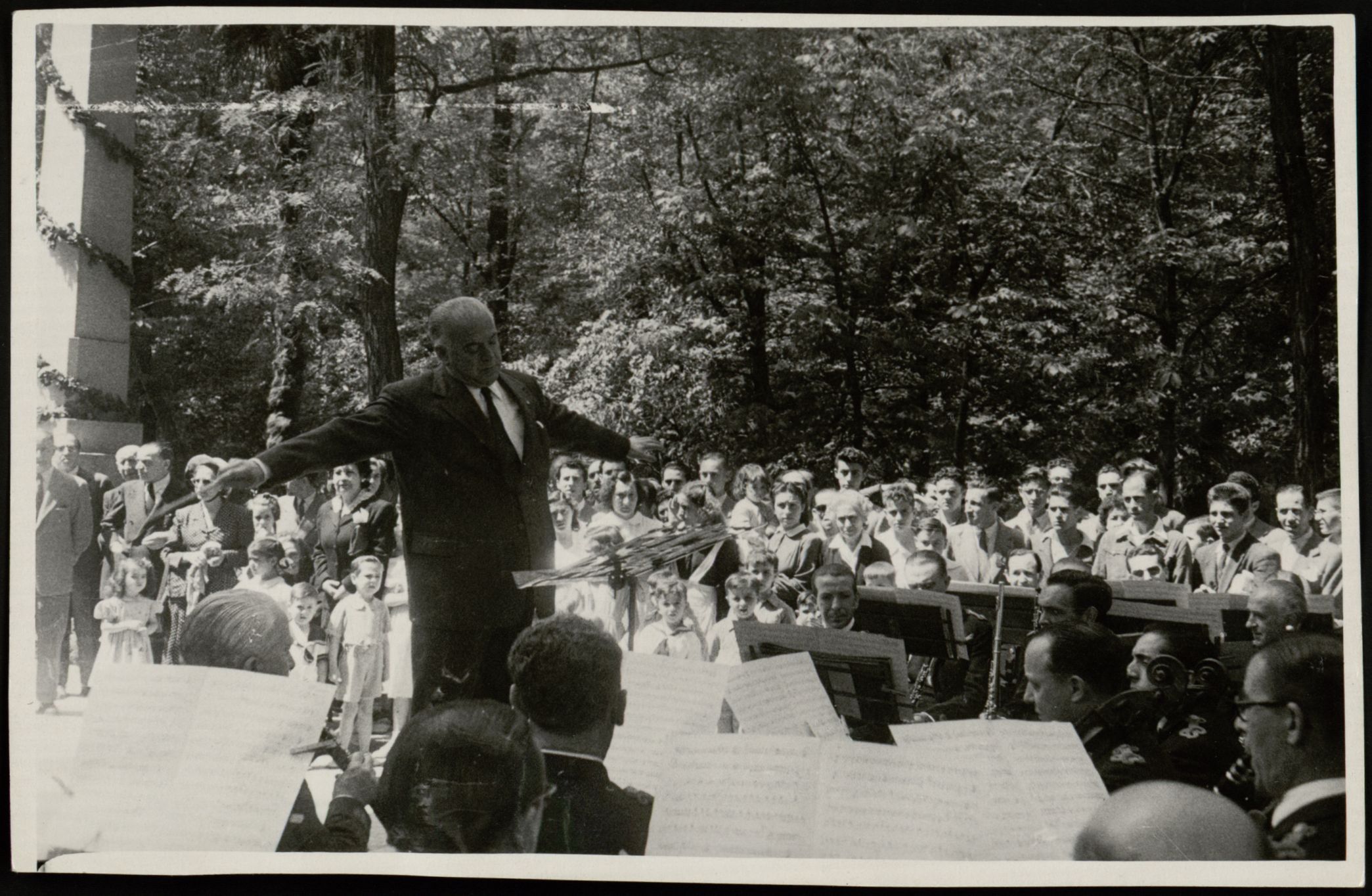 Jacinto Guerrero dirigiendo la Banda Municipal de Madrid en el parque de El Retiro