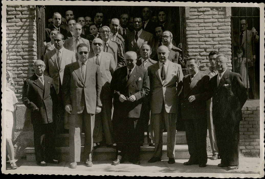 Quince tomas distintas: delante del Teatro Rojas, delante de la Catedral de Toledo y andando por la calle Trastámara. - Entre los asistentes, Federico Moreno Torroba, Francisco Serrano Anguita, Adolfo Torrado, Carretero (presidente de SGAE), Fernández Ardavín, Torres del Álamo, Francisco Alonso y el alcalde de Toledo. - Del mismo evento, pero de distinto fotógrafo, se conserva otra serie fotográfica (signaturas F/315 a F/318). - En el verso, sello: "Foto Rodríguez. Toledo". - De algunas fotografías hay más de una copia
