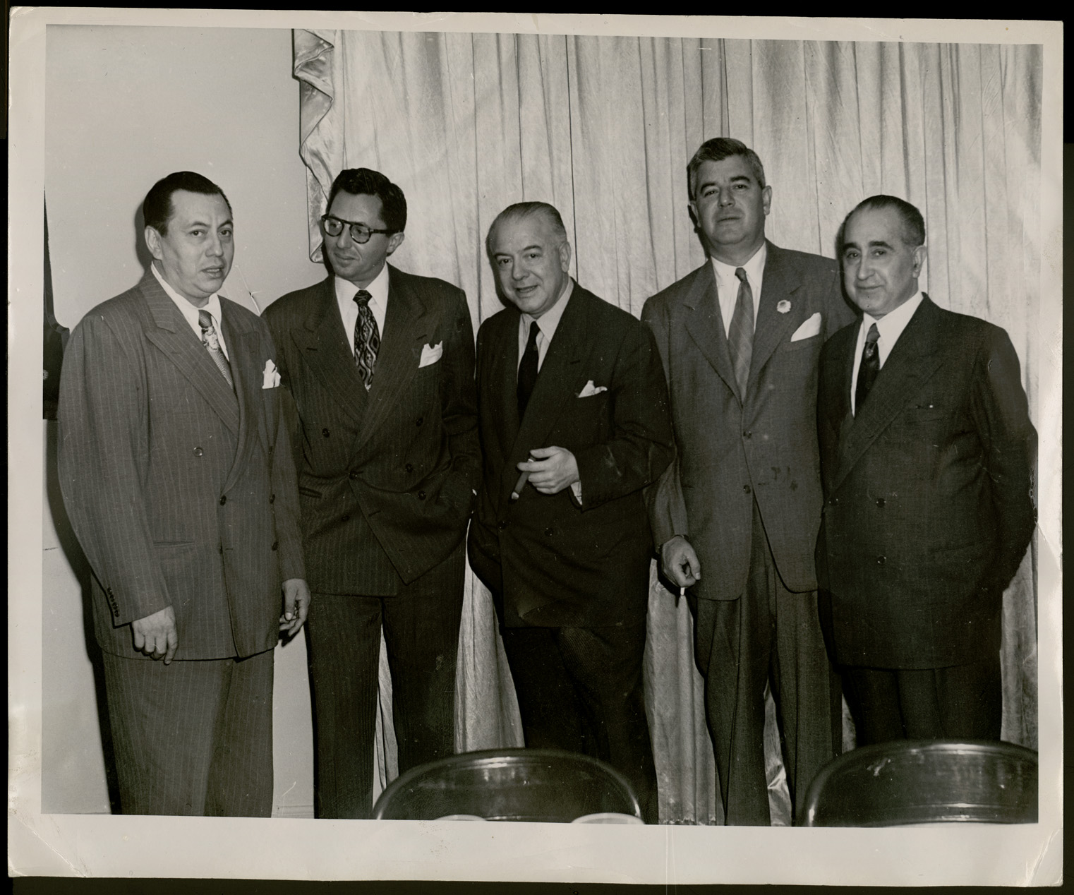 Reunión entre los representantes de las Sociedades de Autores española y americana - Entre los asistentes figura Federico Moreno Torroba, Carl Haverlin, presidente de la BMI (Broadcast Music Inc.) y Jean Geiringer, vicepresidente de la BMI a cargo de las relaciones exteriores