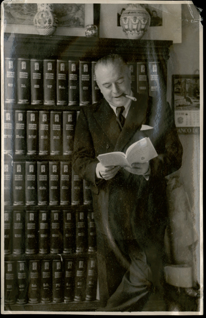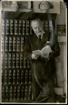 [Jacinto Guerrero en su casa con un libro en las manos]