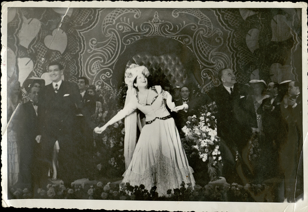 [Jacinto Guerrero saludando al público tras la representación de Cinco minutos nada menos]