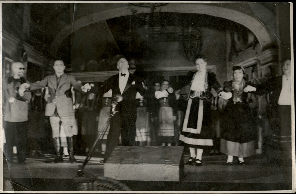 [Jacinto Guerrero saludando al público tras la representación de Loza lozana en el Teatro Coliseum]