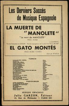 Resto del título: paroles françaises de Liogar ; paroles espagnoles de T. Luca de Tena Brunet ; musique de J. Guerrero. El gato montés : paso-doble torero / Manuel Penella