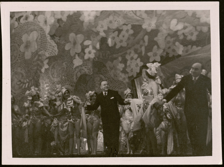Jacinto Guerrero saluda con el reparto al final de una representación