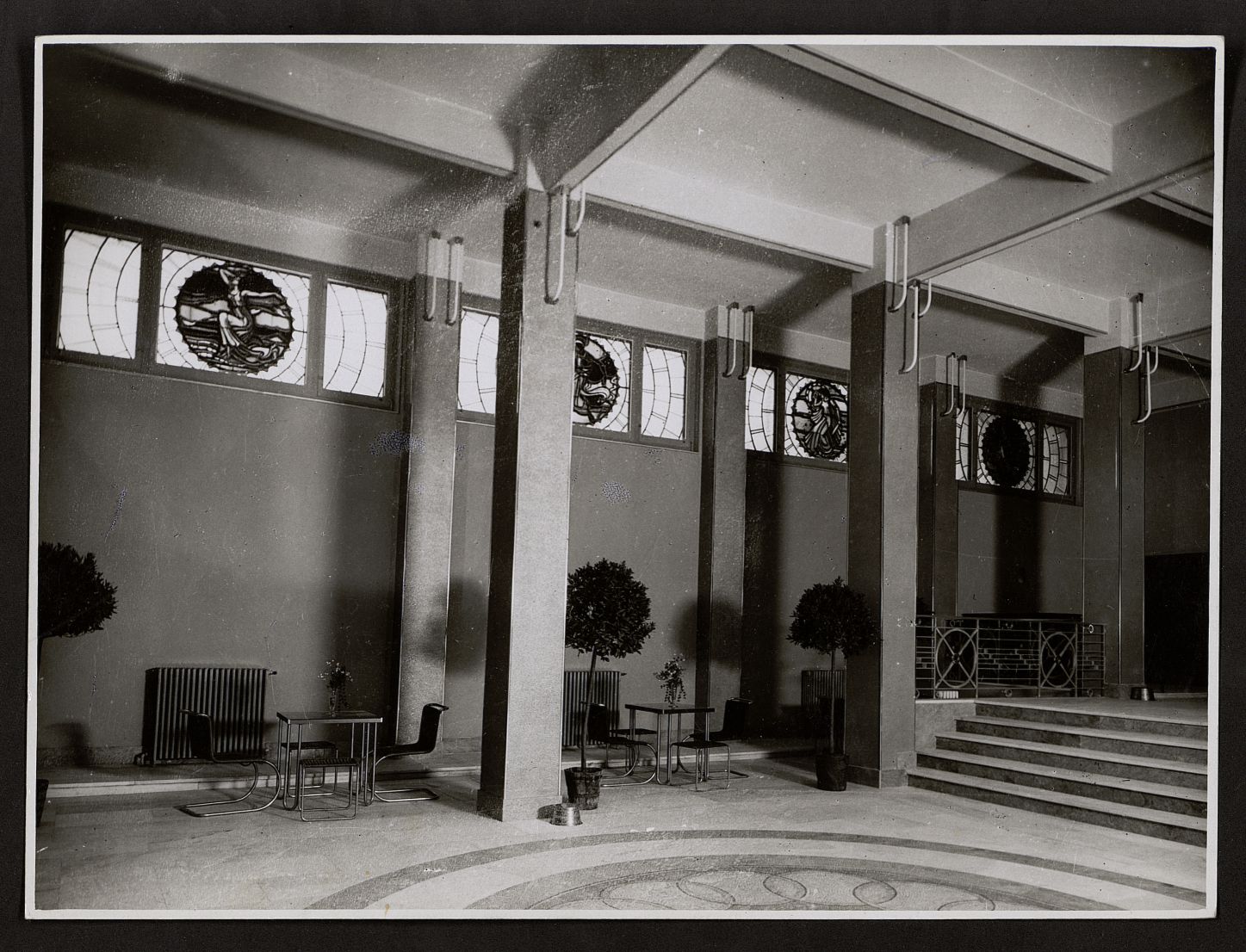 Se ven vidrieras de temas folklóricos diseñadas por Pedro Muguruza. Destruidas durante la Guerra Civil se reconstruyeron siguiendo los diseños originales durante la reforma de los años 1999-2001 (Memoria de Pía López-Izquierdo Botín, consultable en la Gerencia Municipal de Urbanismo)